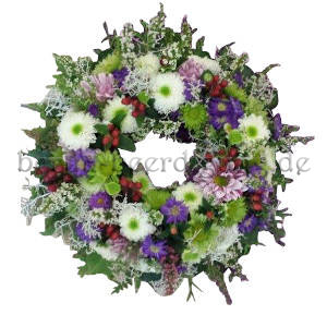 Herbstlicher Kranz für Beerdigung mit Crysanthemen, Beeren in Weiß, Grün & Lila, hinterlegt mit Blattgrün.